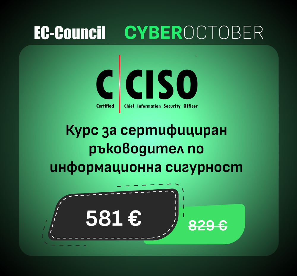 - Еднодневно присъствено или онлайн въвеждащо обучение по темата „Сертифициран ръководител по информационна сигурност“ (Certified Chief Information Security Officer – CCISO), водено от експерти на ТехноЛогика, което ще се проведе на 04.11.2025 г.*;