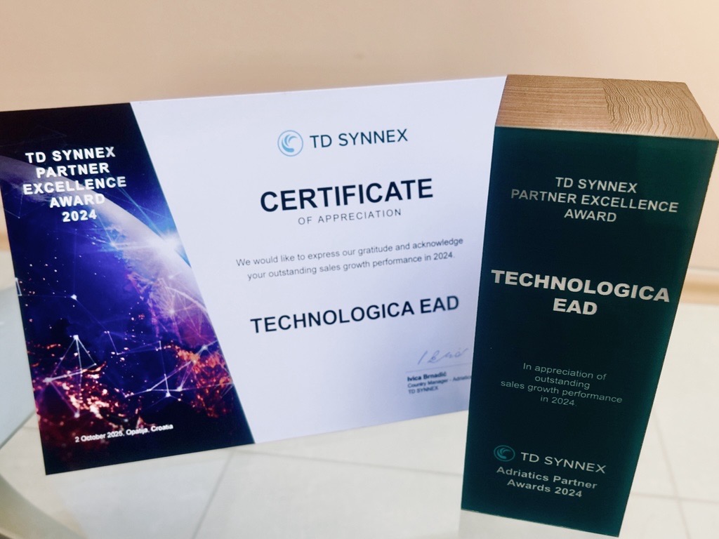 ТехноЛогика получи престижната „Partner Excellence Award 2024“ от водещия световен дистрибутор на IT продукти и услуги TD SYNNEX. Наградата е признание за реализирането на комплексни IT решения за корпоративни клиенти, при които компанията комбинира доставка на лицензи с високотехнологични услуги по въвеждане в експлоатация, миграция, интеграция и оптимизация на системите, гарантирайки максимална ефективност и добавена стойност за клиентите.